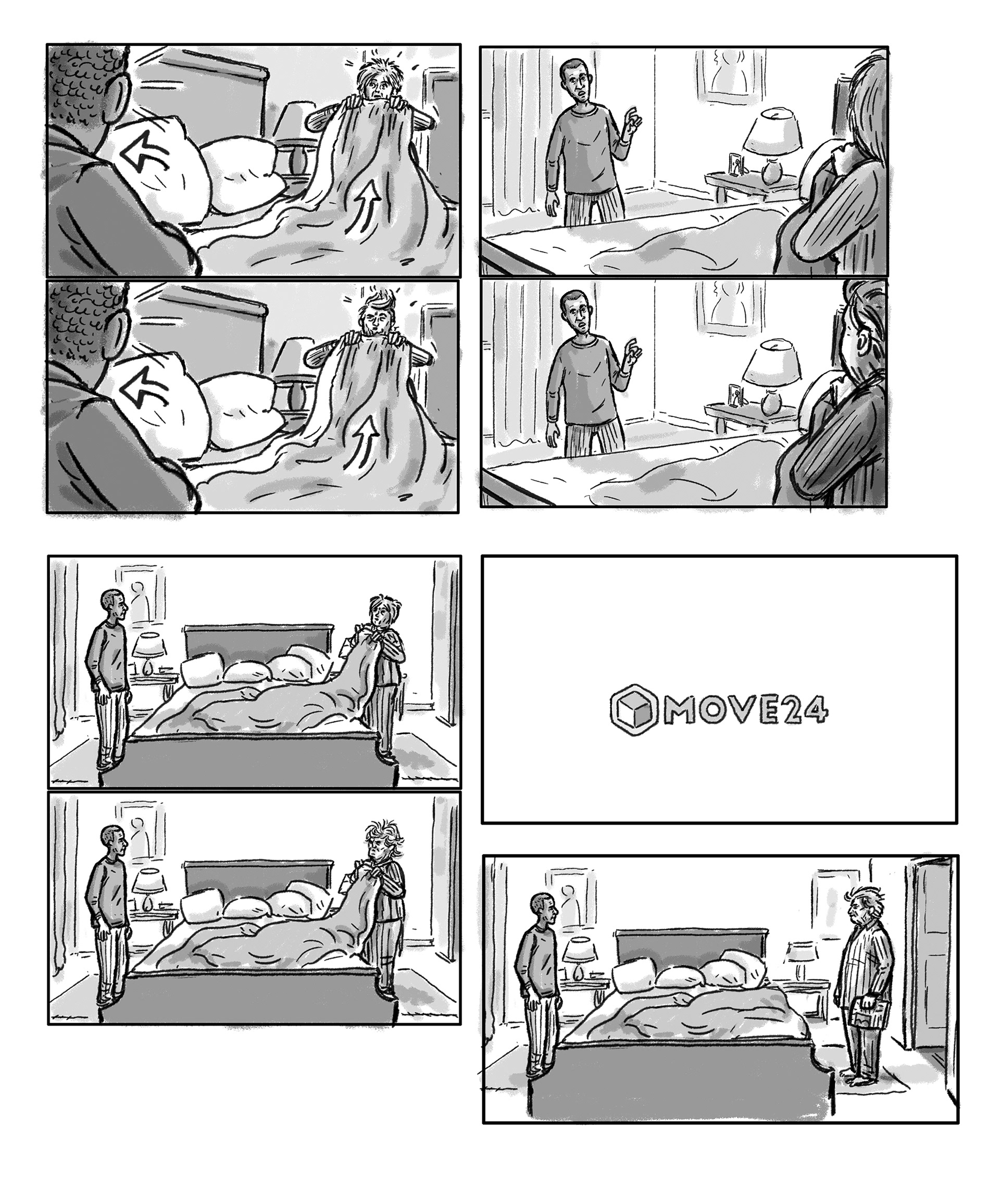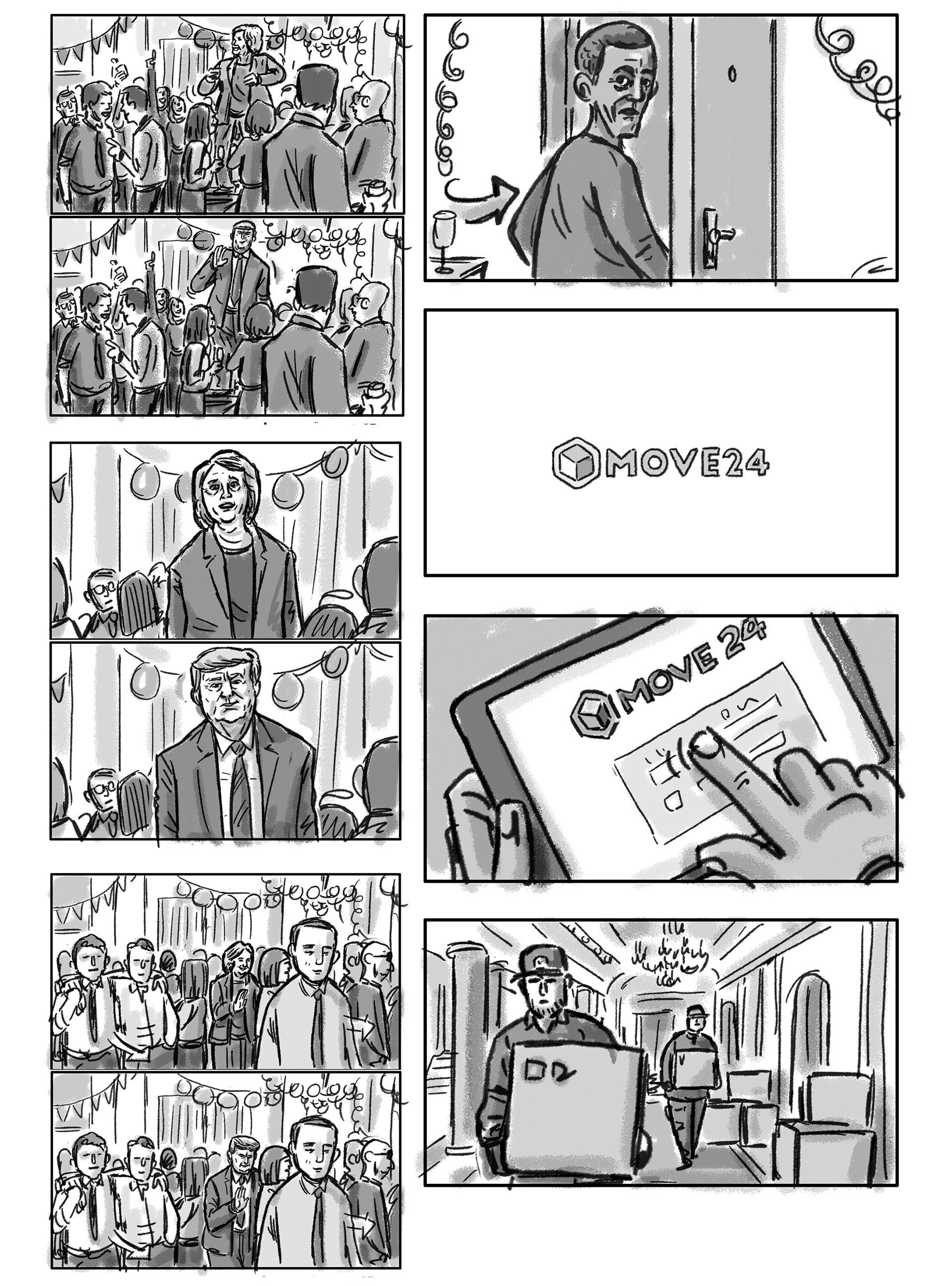 Storyboard for "Move 24", a german moving company. I draw 2 versions of this board, you might by now know wich one they had to choose. Saaad